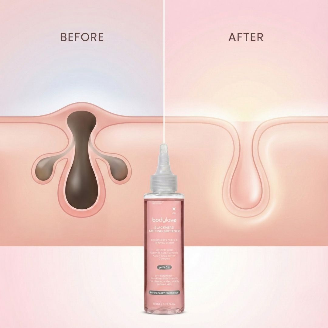 Meet BodyLove Blackhead Melting Water, a smart pore-clearing formula designed to soften, dissolve, and lift out blackheads gently without damaging your skin barrier.