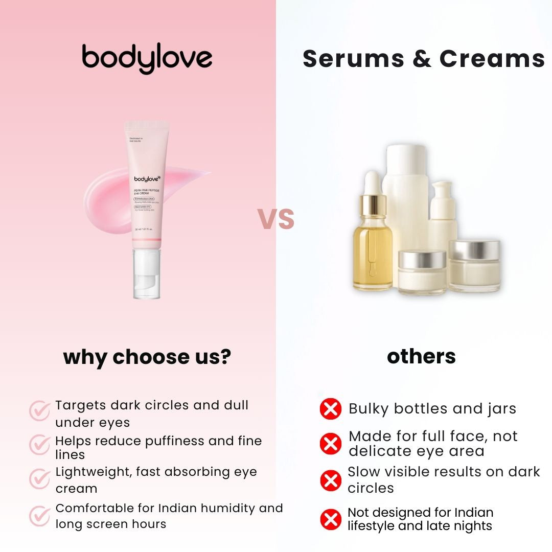 Meet BodyLove PDRN Pink Peptide Eye Cream, made for Indian under eyes that look tired because of late nights, phone screens, and daily sun exposure.